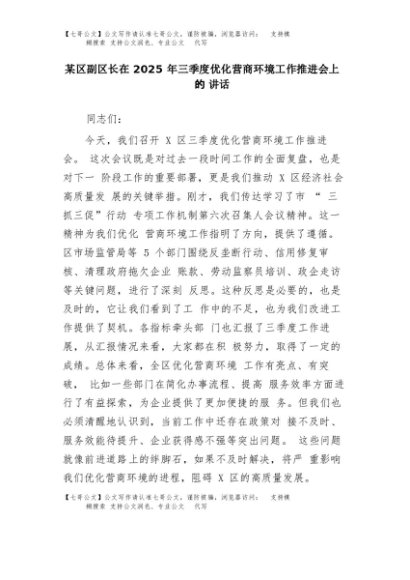 【七哥公文】2025年:某区副区长在2025年三季度优化营商环境工作推进会上的讲话+更多免费公文+VX:QiGeGongWen2024