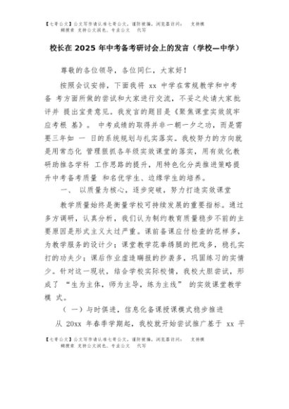 【七哥公文】2025年:校长在2025年中考备考研讨会上的发言(学校—中学)+更多免费公文+VX:QiGeGongWen2024