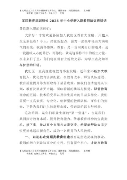 【七哥公文】2025年:某区教育局副局长2025年中小学新入职教师培训班讲话+更多免费公文+VX:QiGeGongWen2024