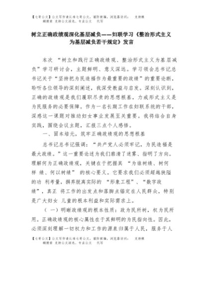 【七哥公文】2025年:树立正确政绩观 深化基层减负——妇联学习《整治形式主义为基层减负若干规定》发言+更多免费公文+VX:QiGeGongWen2024
