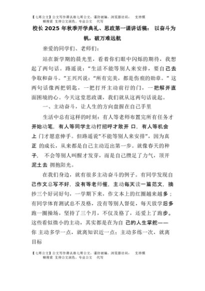 【七哥公文】2025年:校长2025 年秋季开学典礼、思政第一课讲话稿:以奋斗为帆,破万难远航+更多免费公文+VX:QiGeGongWen2024