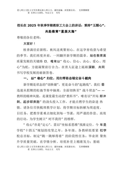 【七哥公文】2025年:校长在2025年秋季学期教职工大会上的讲话:秉持 “五颗心”,共赴教育 “星辰大海”+更多免费公文+VX:QiGeGongWen2024