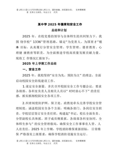 / 【七哥公文】2025年:某中学2025年德育和安全工作总结和计划+更多免费公文+VX:QiGeGongWen2024