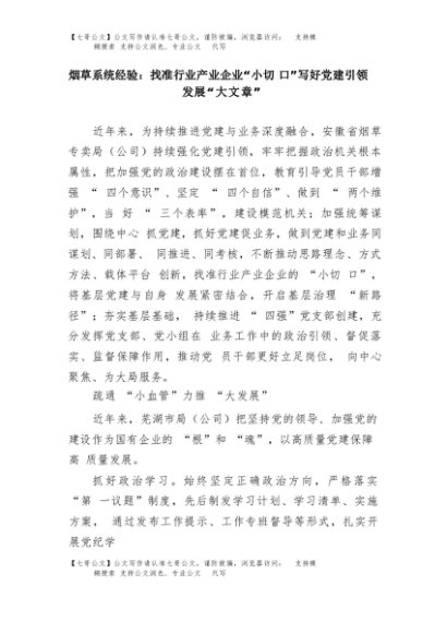 【七哥公文】2025年:烟草系统经验:找准行业产业企业“小切口”写好党建引领发展“大文章”+更多免费公文+VX:QiGeGongWen2024