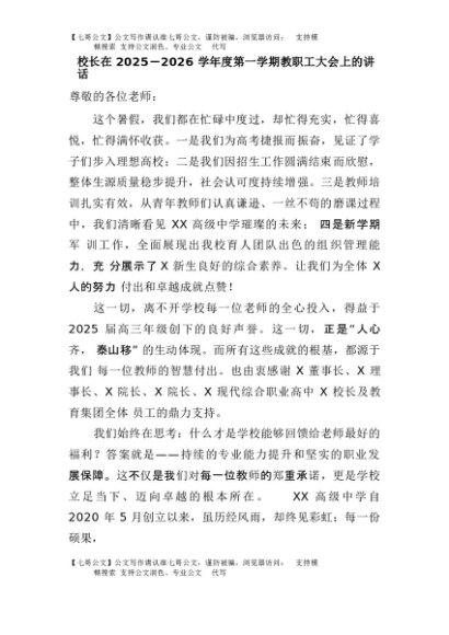 【七哥公文】2025年:校长在2025-2026学年度第一学期教职工大会上的讲话+更多免费公文+VX:QiGeGongWen2024