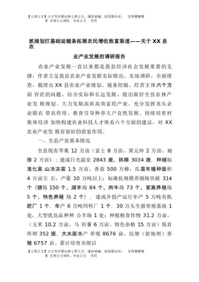 【七哥公文】2025年:抓规划打基础延链条 拓展农民增收致富渠道——关于XX县农业产业发展的调研报告+更多免费公文+VX:QiGeGongWen2024