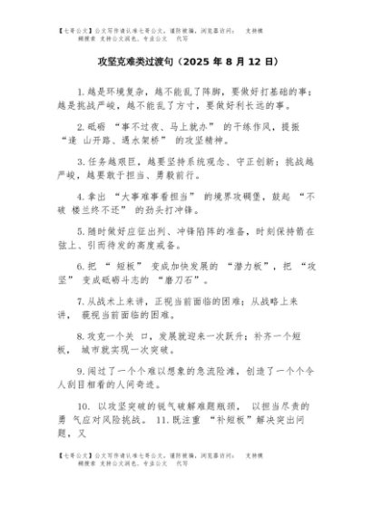/ 【七哥公文】2025年:攻坚克难类过渡句(2025年8月)+更多免费公文+VX:QiGeGongWen2024