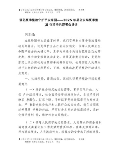【七哥公文】2025年:强化夏季整治守护平安家园——2025年县公安局夏季整治行动动员部署会讲话+更多免费公文+VX:QiGeGongWen2024