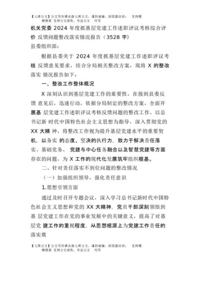 【七哥公文】2025年:机关党委2024年度抓基层党建工作述职评议考核综合评价反馈问题整改落实情况报告(3528字)+更多免费公文+VX:QiGeGongWen2024