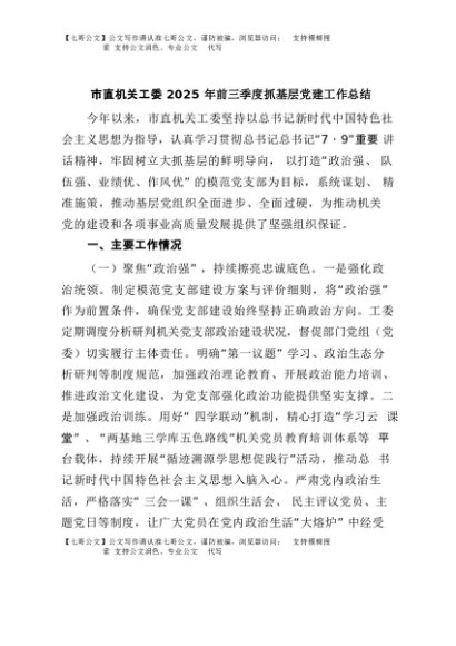 【七哥公文】2025年:市直机关工委2025年前三季度抓基层党建工作总结+更多免费公文+VX:QiGeGongWen2024