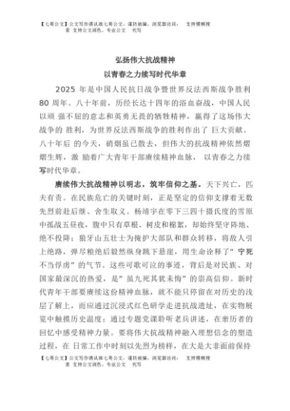 / 【七哥公文】2025年:弘扬伟大抗战精神,以青春之力续写时代华章+更多免费公文+VX:QiGeGongWen2024