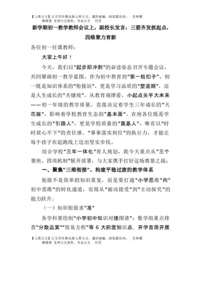 【七哥公文】2025年:新学期初一教学教师会议上,副校长发言:三箭齐发抓起点,四维聚力育新+更多免费公文+VX:QiGeGongWen2024