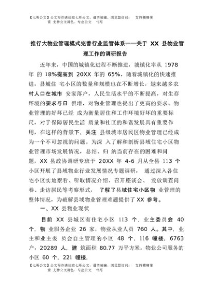 【七哥公文】2025年:推行大物业管理模式 完善行业监管体系——关于XX县物业管理工作的调研报告+更多免费公文+VX:QiGeGongWen2024