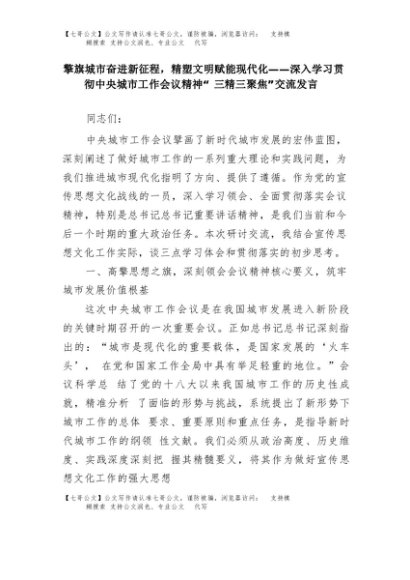 【七哥公文】2025年:擎旗城市奋进新征程,精塑文明赋能现代化——深入学习贯彻中央城市工作会议精神“三精三聚焦”交流发言+更多免费公文+VX:QiGeGongWen2024