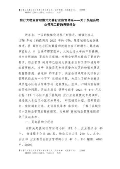 【七哥公文】2025年:推行大物业管理模式 完善行业监管体系——关于吴起县物业管理工作的调研报告+更多免费公文+VX:QiGeGongWen2024