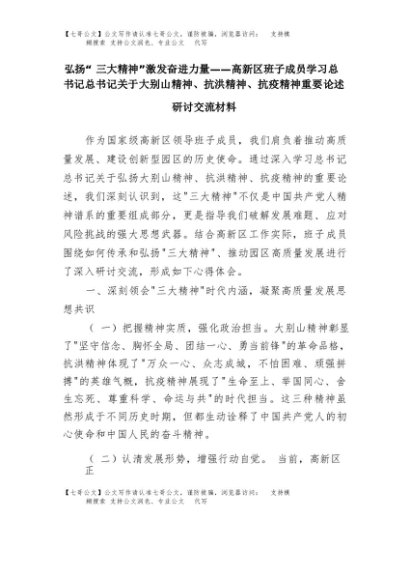 【七哥公文】2025年:弘扬“三大精神” 激发奋进力量——高新区班子成员学习总书记总书记关于大别山精神、抗洪精神、抗疫精神重要论述研讨交流材料+更多免费公文+VX:QiGeGongWen2024