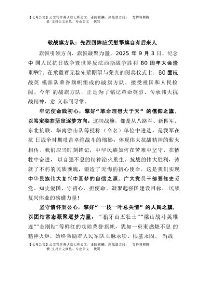 【七哥公文】2025年:敬战旗方队:先烈回眸应笑慰 擎旗自有后来人+更多免费公文+VX:QiGeGongWen2024