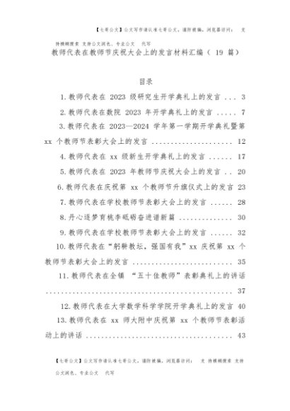 【七哥公文】2025年:教师代表在教师节庆祝大会上的发言材料汇编(19篇)+更多免费公文+VX:QiGeGongWen2024