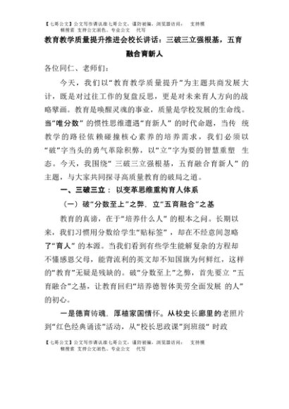 【七哥公文】2025年:教育教学质量提升推进会校长讲话:三破三立强根基,五育融合育新人+更多免费公文+VX:QiGeGongWen2024