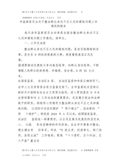 【七哥公文】2025年:市监察委员会关于整治群众身边不正之风和腐败问题工作情况的报告+更多免费公文+VX:QiGeGongWen2024
