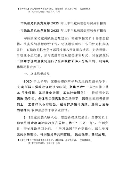 【七哥公文】2025年:市民政局机关党支部2025年上半年党员思想形势分析报告+更多免费公文+VX:QiGeGongWen2024