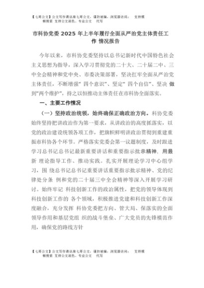 【七哥公文】2025年:市科协党委2025年上半年履行全面从严治党主体责任工作情况报告+更多免费公文+VX:QiGeGongWen2024