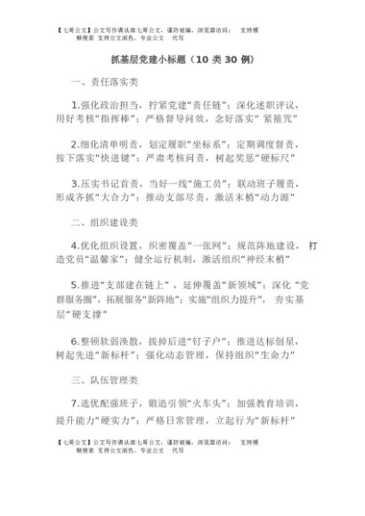 【七哥公文】2025年:抓基层党建小标题(10类30例)+更多免费公文+VX:QiGeGongWen2024