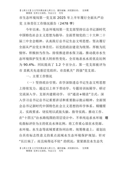 【七哥公文】2025年:市生态环境局第一党支部2025年上半年履行全面从严治党主体责任工作情况报告(2478字)+更多免费公文+VX:QiGeGongWen2024
