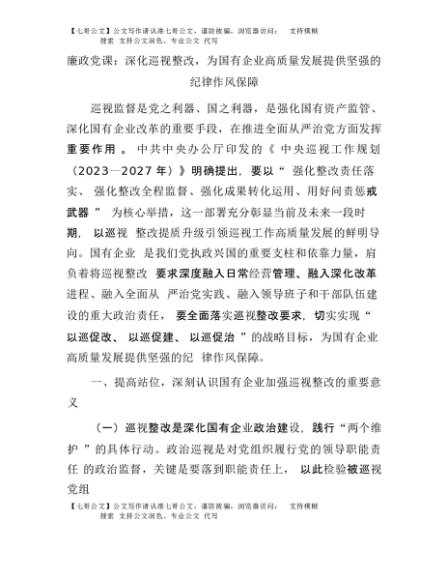 【七哥公文】2025年:廉政党课:深化巡视整改,为国有企业高质量发展提供坚强的纪律作风保障+更多免费公文+VX:QiGeGongWen2024