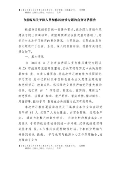 【七哥公文】2025年:市能源局关于深入贯彻作风建设专题的自查评估报告+更多免费公文+VX:QiGeGongWen2024