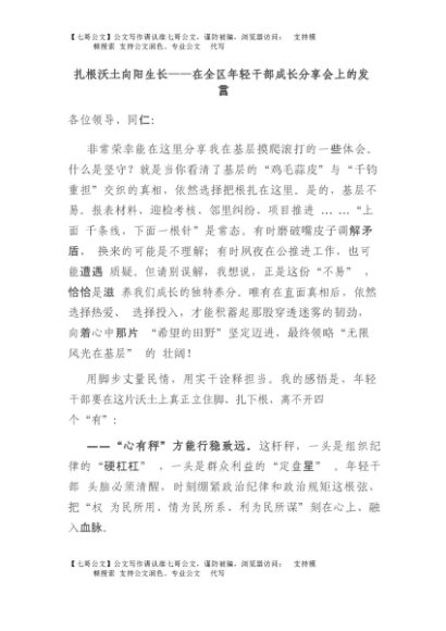 【七哥公文】2025年:扎根沃土向阳生长——在全区年轻干部成长分享会上的发言+更多免费公文+VX:QiGeGongWen2024
