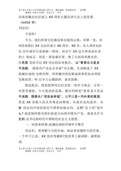 【七哥公文】2025年:庆祝西藏自治区成立60周年主题宣讲大会上的党课(4458字)+更多免费公文+VX:QiGeGongWen2024