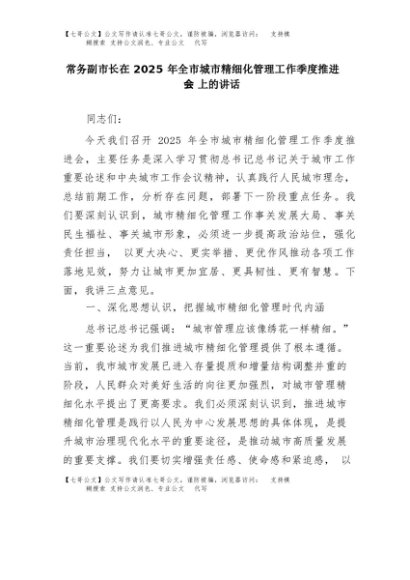 【七哥公文】2025年:常务副市长在2025年全市城市精细化管理工作季度推进会上的讲话+更多免费公文+VX:QiGeGongWen2024