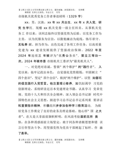 / 【七哥公文】2025年:市级机关优秀党务工作者事迹材料(1329字)+更多免费公文+VX:QiGeGongWen2024
