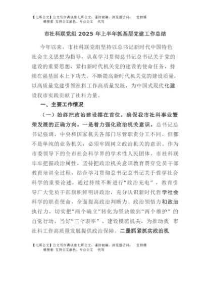 / 【七哥公文】2025年:市社科联党组2025年上半年抓基层党建工作总结+更多免费公文+VX:QiGeGongWen2024