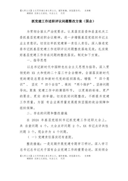 / 【七哥公文】2025年:抓党建工作述职评议问题整改方案(国企)+更多免费公文+VX:QiGeGongWen2024