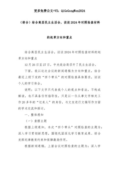 【七哥公文】2025年:(综合)结合高层民主生活会,谈谈2024年对照检查材料的起草方向和重点+更多免费公文+VX:QiGeGongWen2024+更多免费公文+VX:QiGeGongWen2024