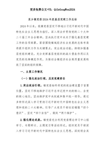 【七哥公文】2025年:某乡镇党委2024年度基层党建工作总结+更多免费公文+VX:QiGeGongWen2024+更多免费公文+VX:QiGeGongWen2024