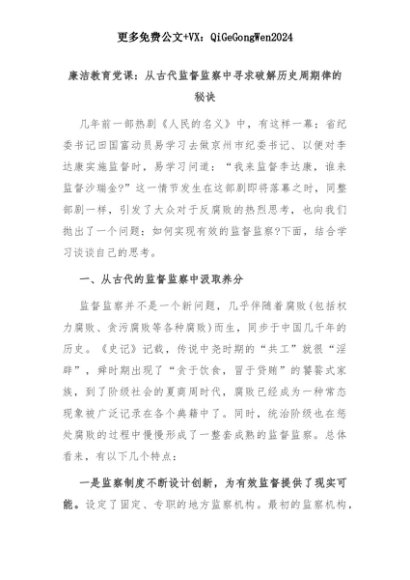 【七哥公文】2025年:廉洁教育党课:从古代监督监察中寻求破解历史周期律的秘诀+更多免费公文+VX:QiGeGongWen2024+更多免费公文+VX:QiGeGongWen2024