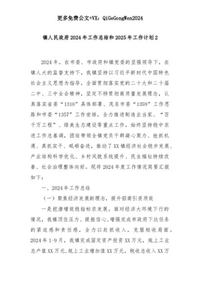【七哥公文】2025年:镇人民政府2024年工作总结和2025年工作计划2+更多免费公文+VX:QiGeGongWen2024+更多免费公文+VX:QiGeGongWen2024