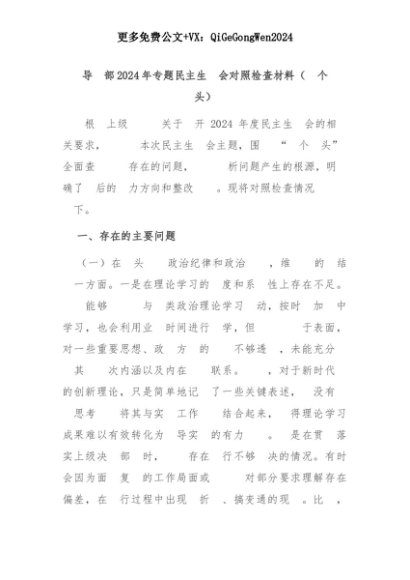 【七哥公文】2025年:领导干部2024年专题民主生活会对照检查材料(四个带头)+更多免费公文+VX:QiGeGongWen2024+更多免费公文+VX:QiGeGongWen2024