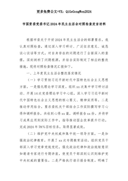 【七哥公文】2025年:市国资委党委书记2024年民主生活会对照检查发言材料+更多免费公文+VX:QiGeGongWen2024+更多免费公文+VX:QiGeGongWen2024