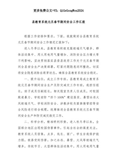 【七哥公文】2025年:县教育系统元旦春节期间安全工作汇报+更多免费公文+VX:QiGeGongWen2024+更多免费公文+VX:QiGeGongWen2024