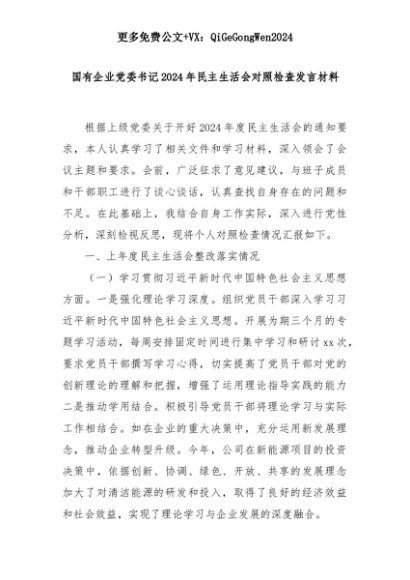 【七哥公文】2025年:国有企业党委书记2024年民主生活会对照检查发言材料+更多免费公文+VX:QiGeGongWen2024+更多免费公文+VX:QiGeGongWen2024