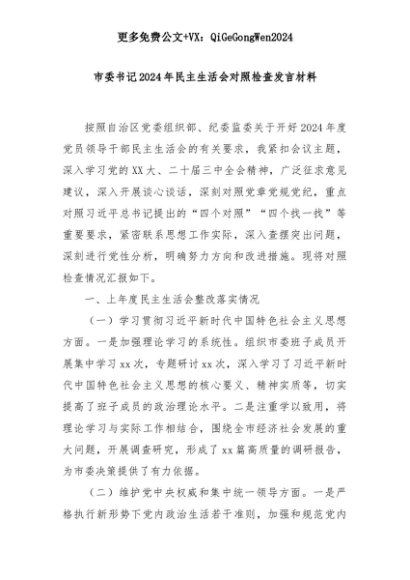 【七哥公文】2025年:市委书记2024年民主生活会对照检查发言材料+更多免费公文+VX:QiGeGongWen2024+更多免费公文+VX:QiGeGongWen2024