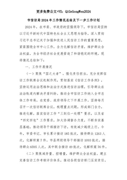 【七哥公文】2025年:市信访局2024年工作情况总结及下一步工作计划+更多免费公文+VX:QiGeGongWen2024+更多免费公文+VX:QiGeGongWen2024