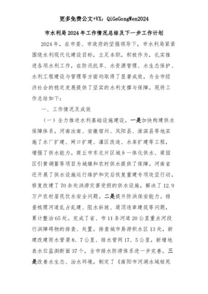 【七哥公文】2025年:市水利局2024年工作情况总结及下一步工作计划+更多免费公文+VX:QiGeGongWen2024+更多免费公文+VX:QiGeGongWen2024