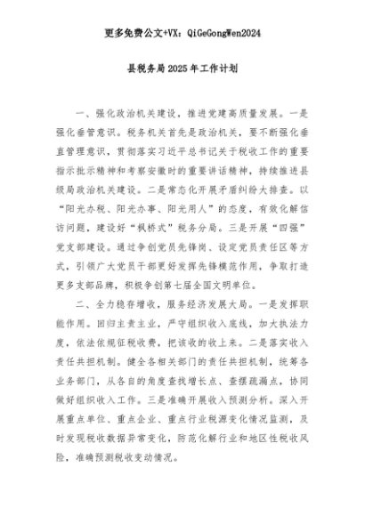 【七哥公文】2025年:县税务局2025年工作计划+更多免费公文+VX:QiGeGongWen2024+更多免费公文+VX:QiGeGongWen2024