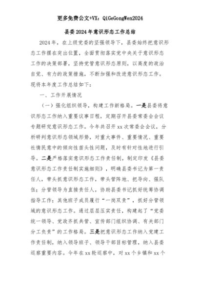 【七哥公文】2025年:县委2024年意识形态工作总结+更多免费公文+VX:QiGeGongWen2024+更多免费公文+VX:QiGeGongWen2024