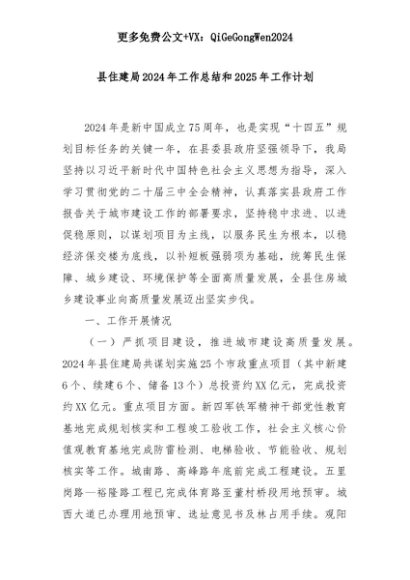【七哥公文】2025年:县住建局2024年工作总结和2025年工作计划+更多免费公文+VX:QiGeGongWen2024+更多免费公文+VX:QiGeGongWen2024
